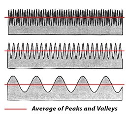 | As a measure of surface texture or topography, Ra is a fairly crude tool. It measures only the average absolute value of deviations (peaks and troughs) of the surface profile from the arithmetic mean. For example, the surface profiles shown at the right, while having very different surface textures, all have the same Ra. → | ![]() |