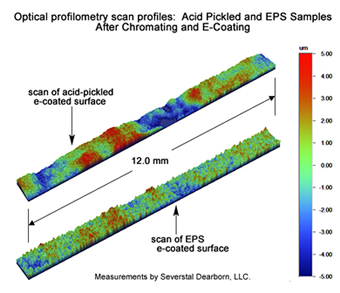 The clearest evidence of this was a study in which the surface of EPS and acid-pickled steel strips were analyzed side-by-side using optical profilometery. The study first measured the surface texture of bare samples, then repeated the measurements after chromating (paint pretreatment) and then again after e-coat painting of the samples. The acid pickled sample had a lower Ra than the EPS sample to begin with, and the Ra of both EPS and acid pickled samples became lower with each successive layer of coating applied.